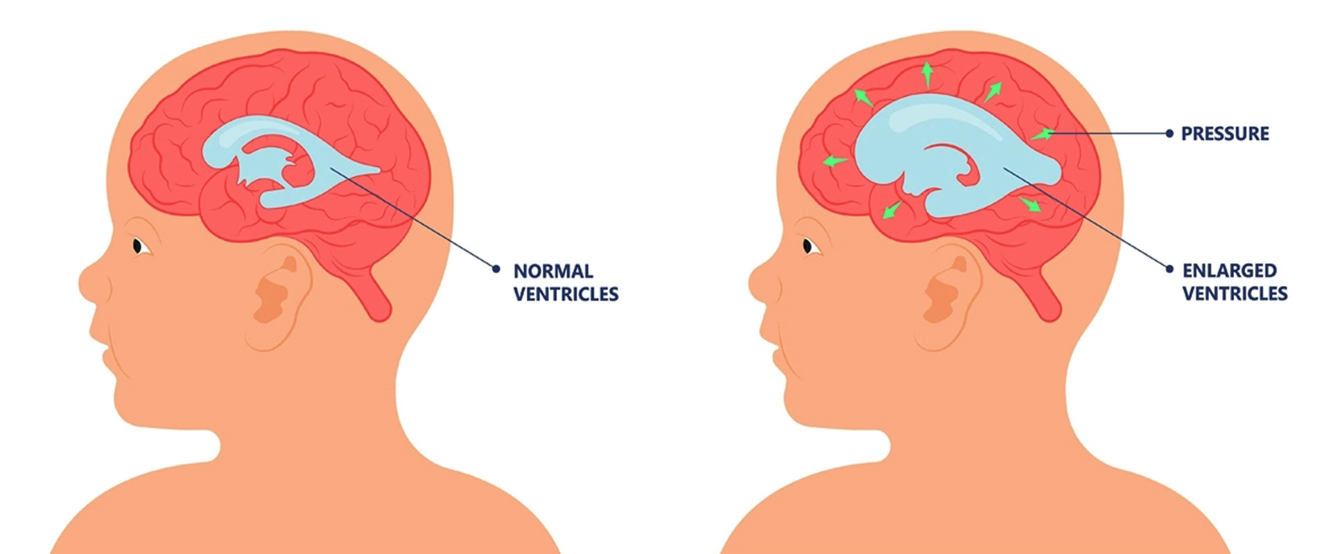 Hydrocephalus implies excessive accumulation of fluid in the ventricles of the brain. This may lead to an abnormal enlargement of the head, squint and change in consciousness of the child. There are many causes of hydrocephalus from infection, haemorrhage, tumours, trauma to unknown causes.